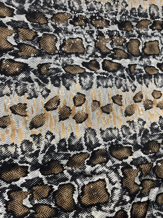 New Exotic snake skin design print on poly spandex with clear sequins 4-way stretch medium weight 58/60” Sold by the YD. Ships Worldwide