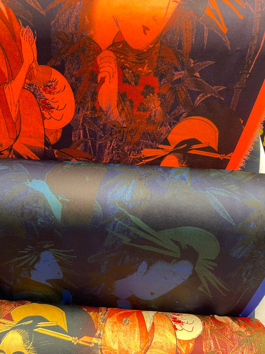 New Japanese design print on poly spandex sapphire multicolor 4-way stretch 58/60” Sold by the YD. Ships Worldwide from Los Angeles Californ