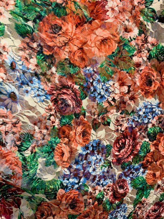 New Stretch lace flower design multicolor 4-way spandex 58/60” Sold by the YD. Ships worldwide from Los Angeles California USA.