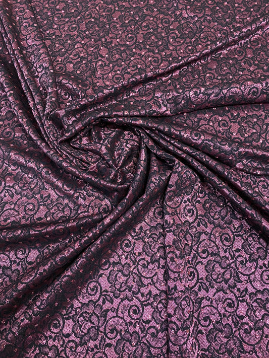New lace Sofia design plum/black stretch lace with glitter dots 58/60” Sold by the YD. Ships Worldwide from Los Angeles California USA.