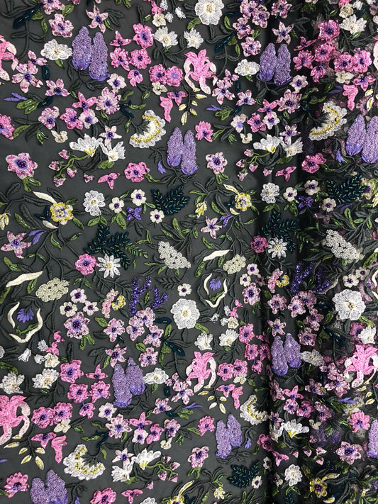 New embroidered black lace flower design 2-way stretch 55/57” Sold by the YD. Ships worldwide from Los Angeles California USA.
