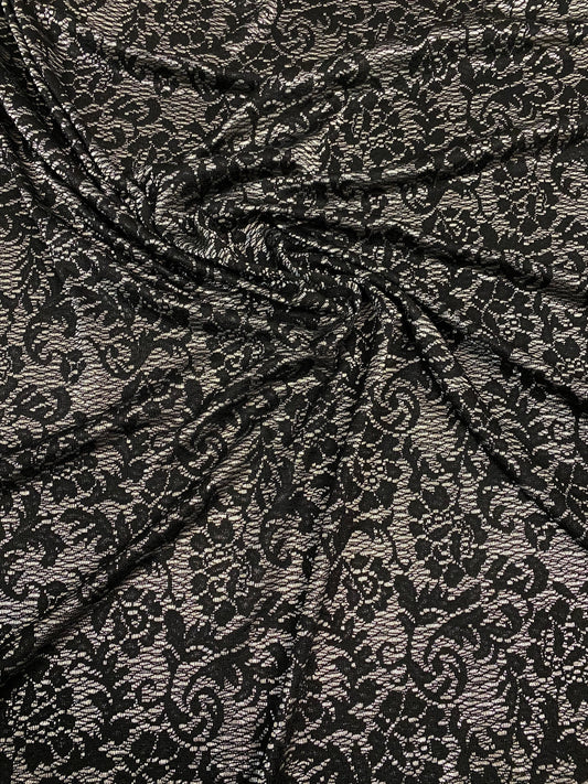 New Victoria design stretch lace black/silver 4-way stretch 58/60” Sold by the YD. Ships Worldwide from Los Angeles California USA.
