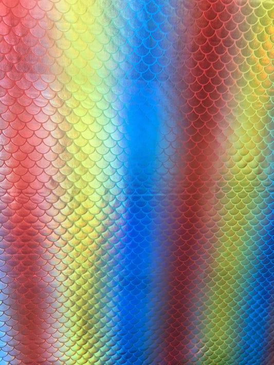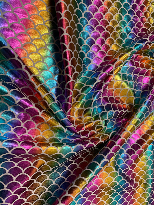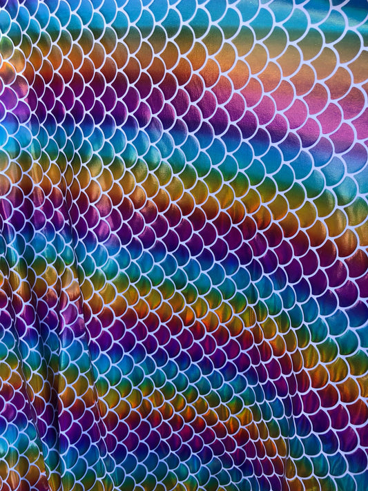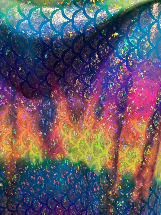 New rainbow mermaid fish scale foil on nylon spandex 4way Stretch 58/60" Sold by the YD. Ships worldwide from Los Angeles California USA