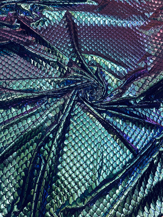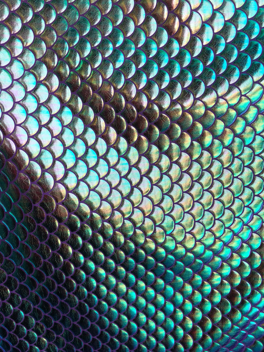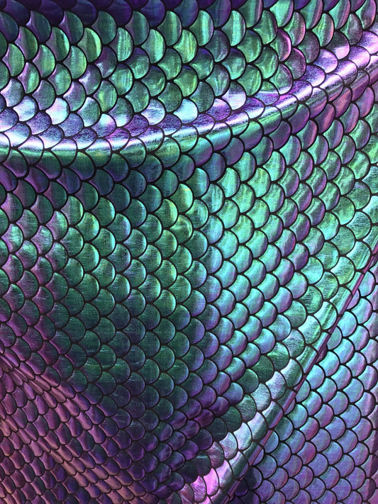 New mermaid design iridescent purple green fish scales foil 4way Stretch 58/60" Sold by the YD. Ships Worldwide from Los Angeles California.