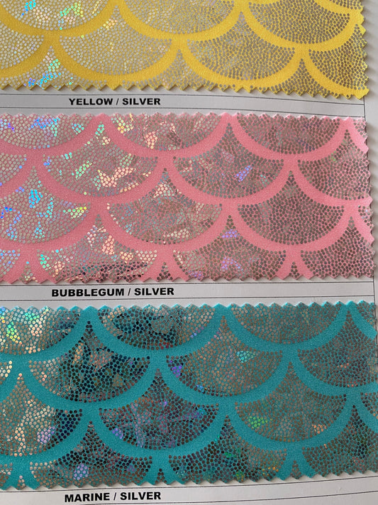 Mermaid design hologram foil on nylon spandex 4way stretch 58/60" medium size Sold by the YD. Ships worldwide from L.A CA