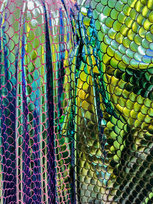 New iridescent green small mermaid design metallic hologram spandex 4-way stretch 58/60” Sold by the YD. Ships worldwide from Los Angeles CA