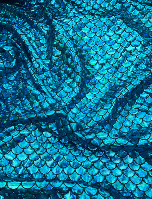 Mermaid design big jumbo size Hologram all over foil on nylon spandex base 58/60" Sold by the yd. Ships worldwide from Los Angeles CA, USA