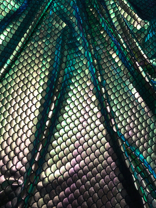 Iridescent green mermaid fish scale design. Spandex Fabric 4way. Sold by the yd. 60" inches