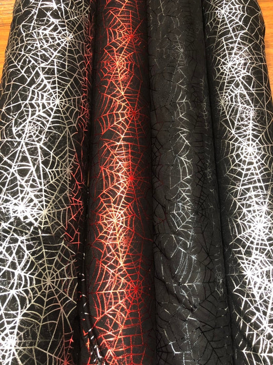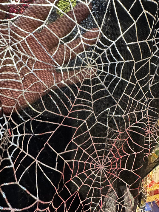 Spider web design with metallic foil on poly mesh 2way stretch 58/60" Sold by the YD. Ships worldwide from Los Angeles California USA.