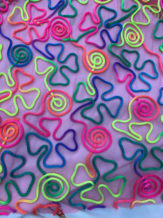 New stretch mesh swirl design rainbow color 2way stretch 55/57" Sold by the YD. Ships worldwide from Los Angeles California USA.