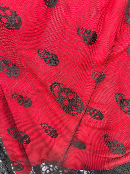 Skull Halloween design black poly mesh 2-way stretch 58/60” Sold by the YD. Ships worldwide from Los Angeles California USA
