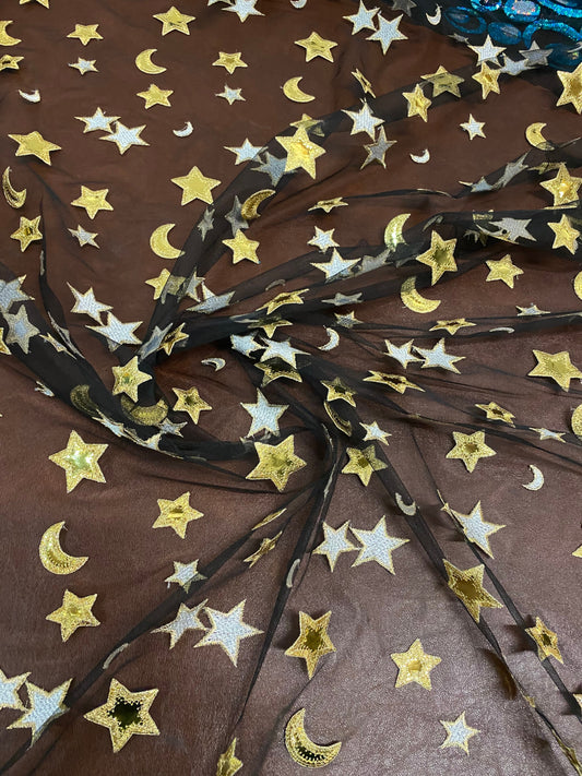 New stars and moons design shining gold vinyl in black poly mesh 2-way stretch 58/60” Sold by the YD. Ships worldwide from Los Angeles CA.