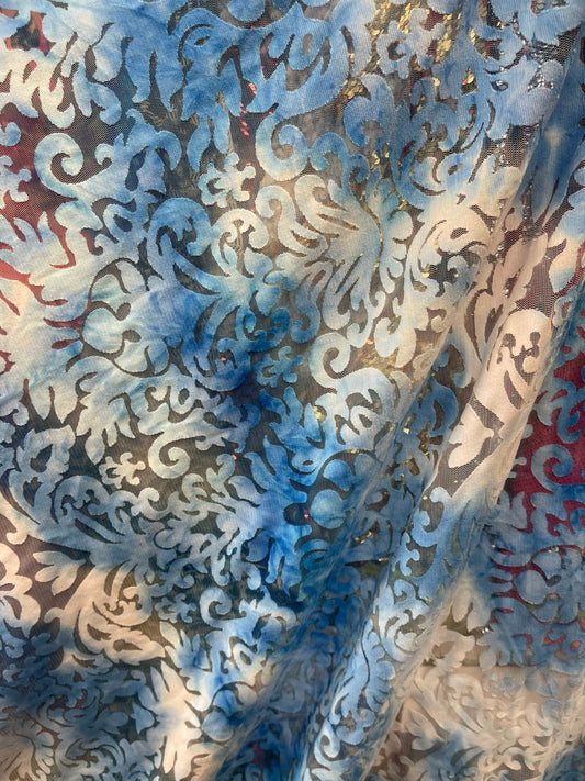 New Tie Dye damask design burnout stretch mesh 2-way 58/60” Sold by the YD. Ships Worldwide from Los Angeles California USA.