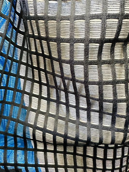 Square geometric design black/black on stretch mesh 2-way 58/60” Sold by the YD. Ships worldwide from Los Angeles California USA