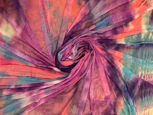 Cotton candy tie dye nylon power mesh 4-way stretch 58/60” Sold by the YD. Ships worldwide from Los Angeles California USA.