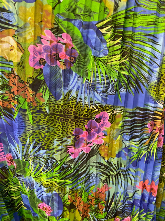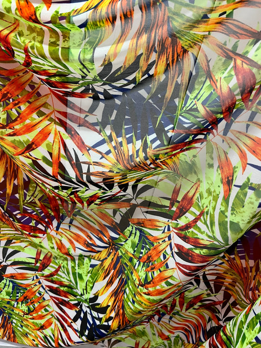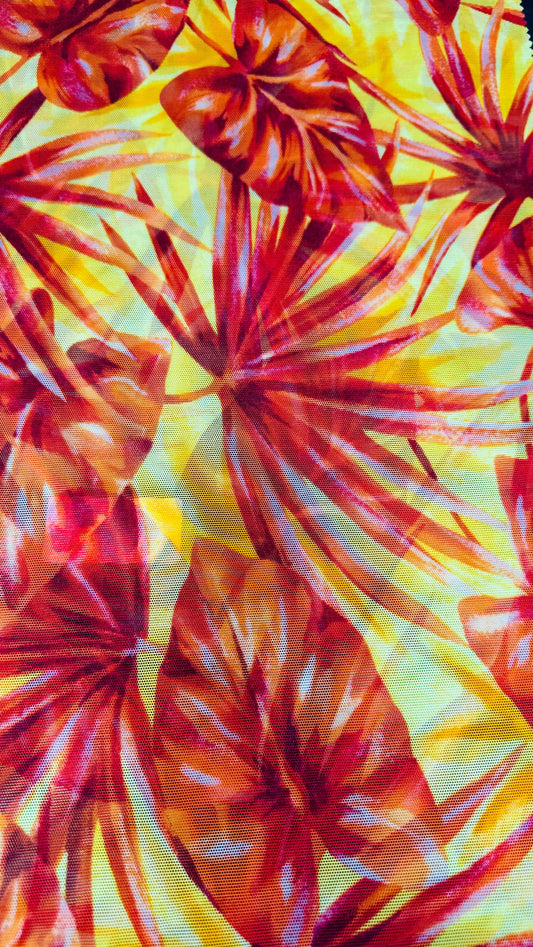New Hawaiian leaves design with neon colors print on great quality of nylon power mesh 4-way stretch 58/60”