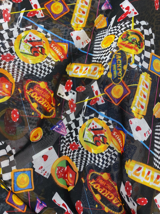 New Vegas design print on power mesh spandex 4-way stretch medium weight 58/60” Sold by the YD. Ships worldwide from Los Angeles California