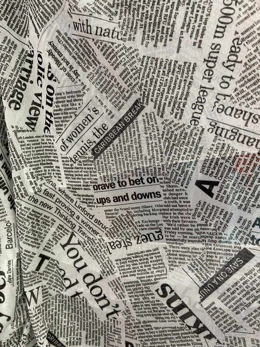 News paper design print on great quality of power mesh 4-way stretch 58/60” Sold by the YD. Ships Worldwide from Los Angeles California USA.