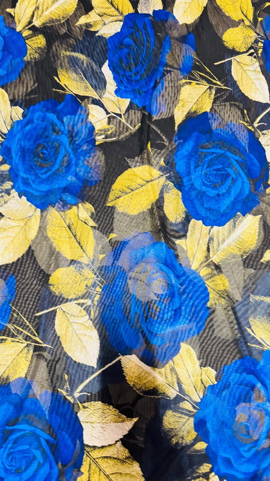 New Romantic Sapphire/Yellow flower design print on great quality of power mesh 4-way stretch 58/60” High Quality fabrics by AlexLAFabrics