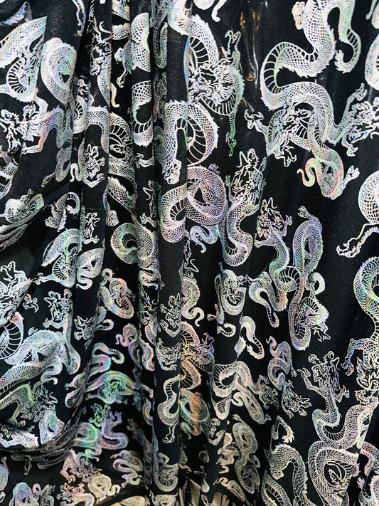 New Exotic Dragon design Iridescent black silver metallic power mesh 4-way stretch 58/60”
