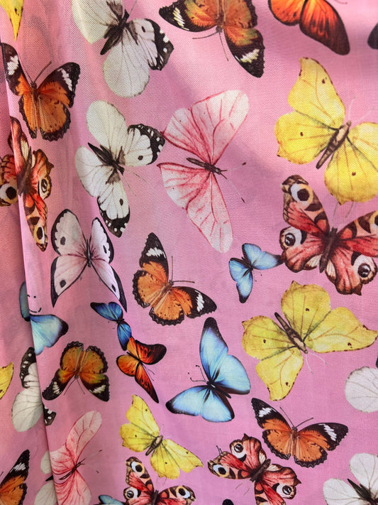 Butterfly design Pink Multicolor print on great quality of power mesh 4-way stretch 58/60” Sold by the YD. Ships Worldwide from Los Angeles