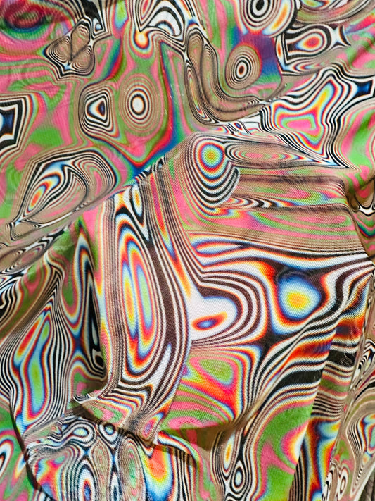 New Modern abstract liquid lava design multicolor print on best quality of power mesh spandex 4-way stretch 58/60” Sold by the YD.