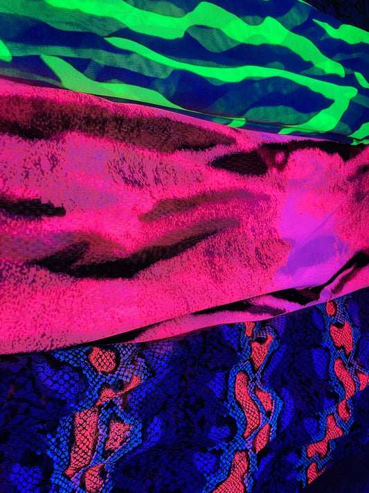 New Uv Light power mesh Exotic animal prints on mesh 4-way stretch 58/60” these mesh fabrics they glow in the dark with a black light