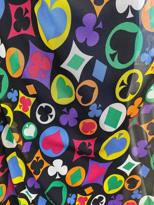Symbol playing cards designs print on power mesh 4-way stretch 58/60” Sold by the YD. Ships Worldwide from Los Angeles California USA.