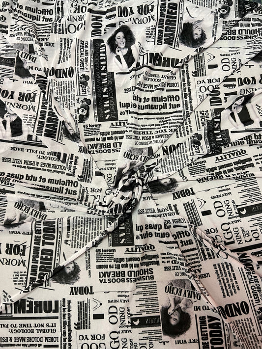 News paper fashion design print on great quality of power mesh 4-way stretch 58/60” Sold by the YD. Ships Worldwide from Los Angeles CA