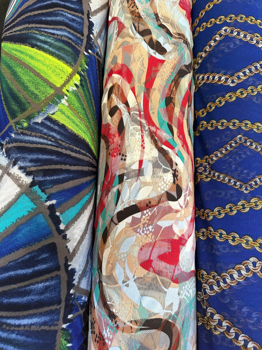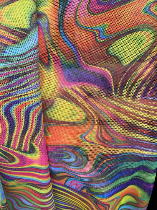 Swirl design multicolor print on power mesh nylon spandex 4-way stretch 58/60” Sold by the YD. Ships worldwide from Los Angeles California