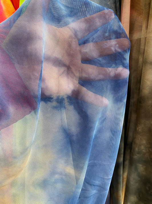 Tie dye power mesh multicolor 4-way stretch 58/60” Sold by the YD. Ships Worldwide from Los Angeles California USA.