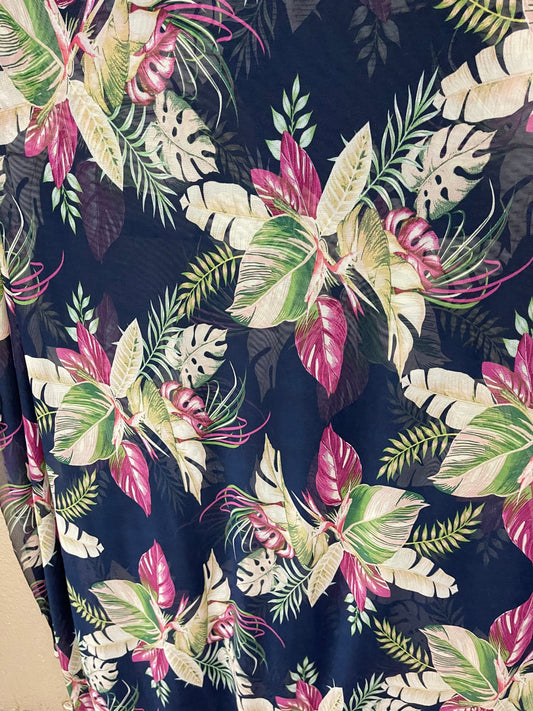 Tropical design navy/multicolor print on great quality of nylon power mesh 4-way stretch 58/60” Sold by the YD. Ships Worldwide from L.A CA