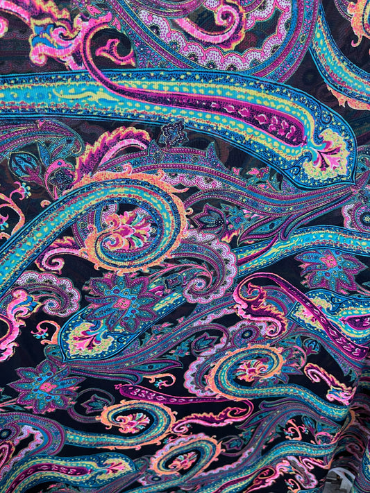 Paisley design Multicolor print on great quality of power mesh 4-way stretch 58/60” Sold by the YD. Ships Worldwide from Los Angeles cali