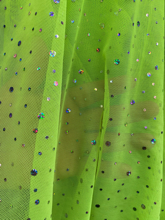 New power mesh neon green with hologram sequins all over 4-way stretch 58/60” Sold by the YD. Ships worldwide from Los Angeles California US