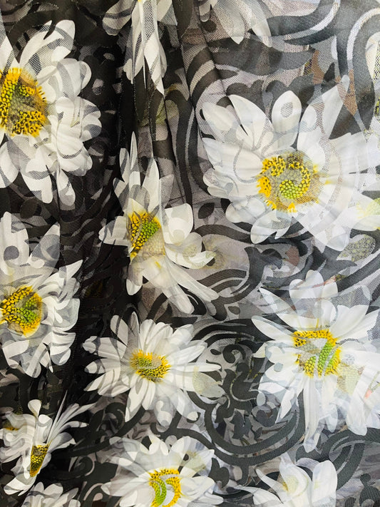 New Sunflower design print on burnout mesh 4-way stretch 58/60” Sold by the YD. Ships Worldwide from Los Angeles California USA.