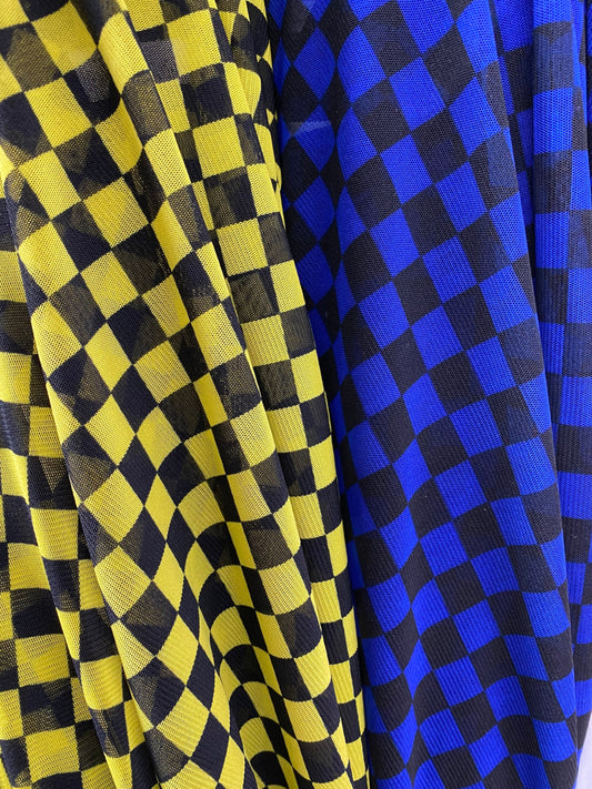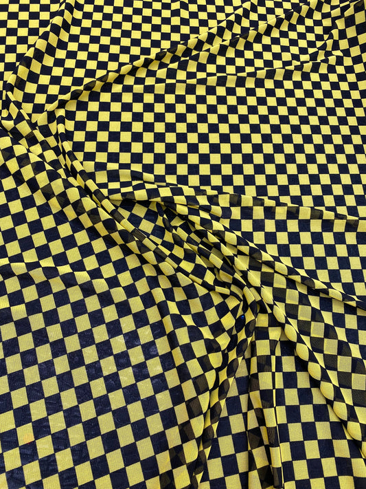 New small Checkered design yellow/black print on power mesh 4-way stretch 58/60” Sold by the YD. Ships worldwide from Los Angeles California