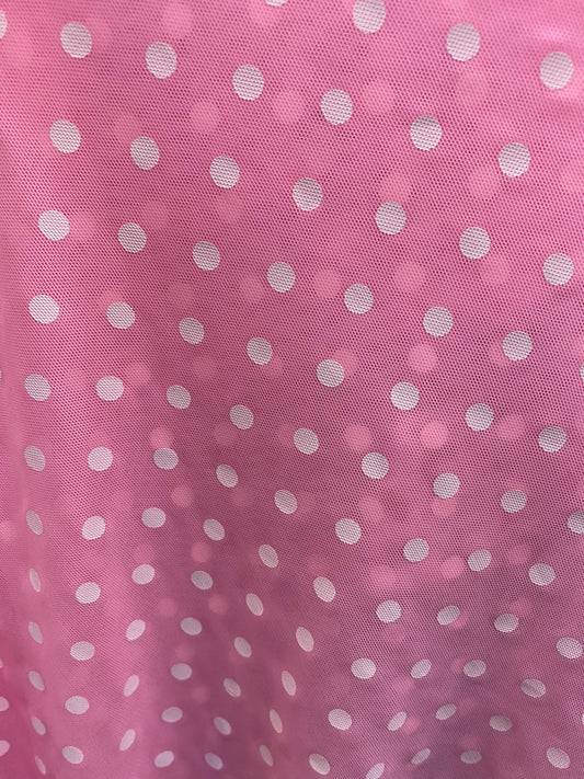 New polka dots design print on power mesh 4-way stretch pink/white 58/60” Sold by the YD. Ships worldwide from Los Angeles California USA.