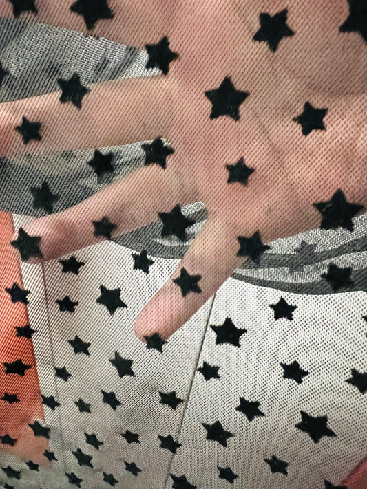 New Stars design flocking stars on stretch power mesh 4-way 58/60” Sold by the YD. Ships Worldwide from Los Ángeles California USA.
