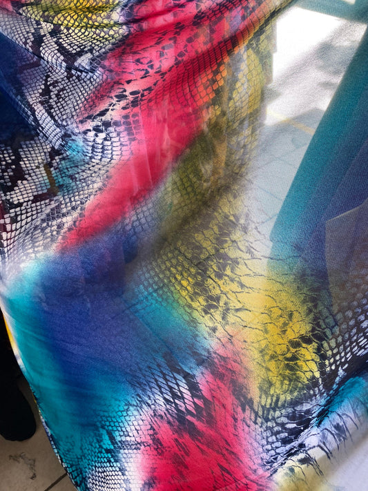 New exotic snake design print on tie dye mesh multicolor 58/60” Sold by the YD. Ships worldwide from Los Ángeles California USA.