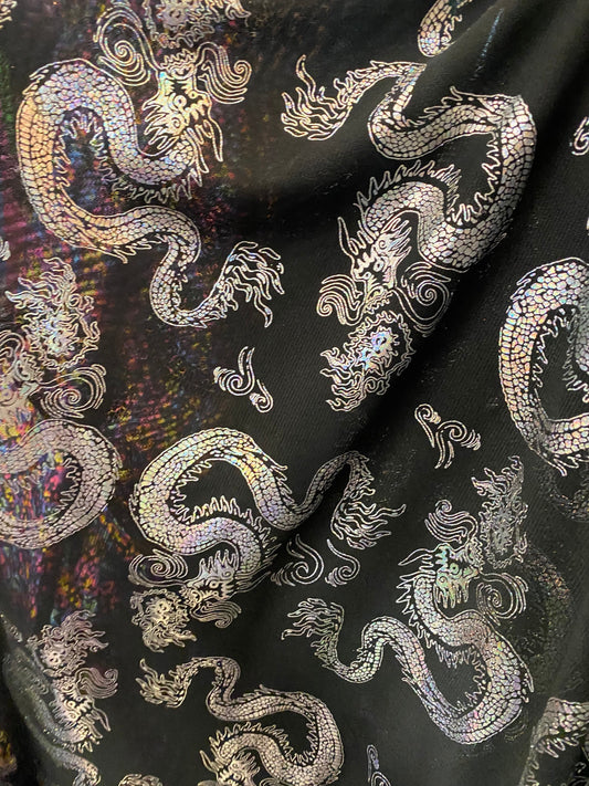 New Exotic Dragon design print on power mesh black/silver 4-way stretch 58/60” Sold by the YD. Ships Worldwide from Los Angeles California