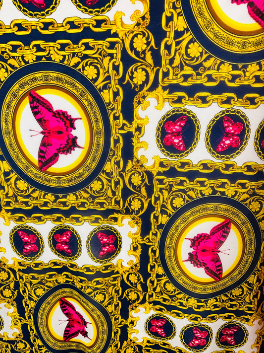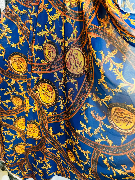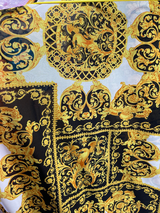 New Fashion brand design sapphire/Gold print on great quality of nylon power mesh 4-way stretch 58/60” Sold by the YD.
