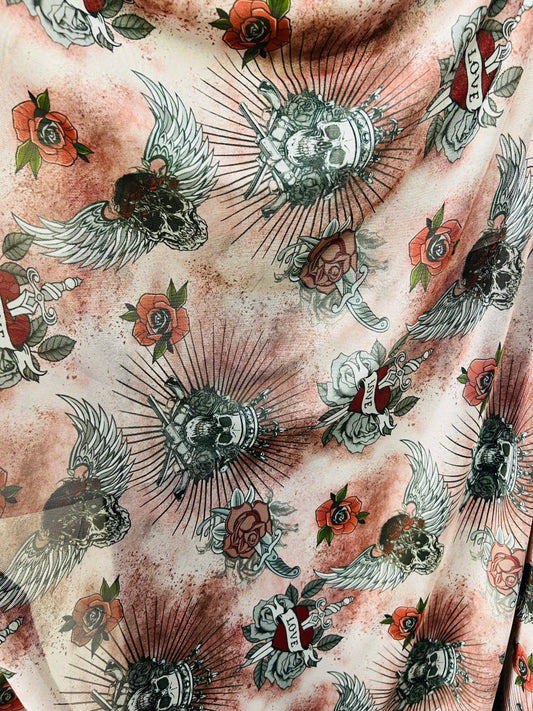 New King Skull design print on best quality of power mesh nylon spandex 4-way stretch 58/60” Sold by the YD. Ships Worldwide from L.A
