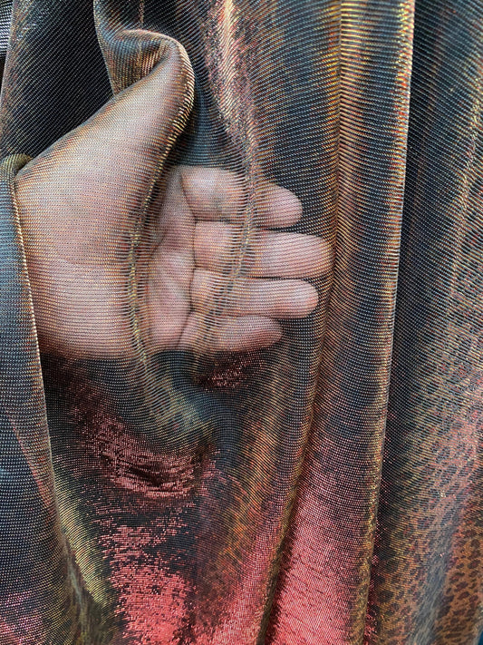 New metallic mesh with exotic leopard design 4-way stretch 58/60” Sold by the YD. Ships Worldwide from Los Angeles California USA.