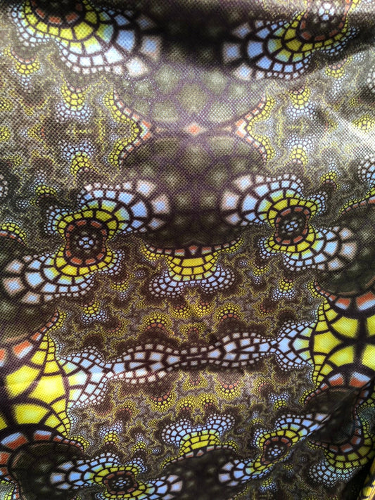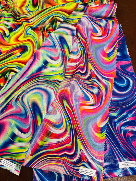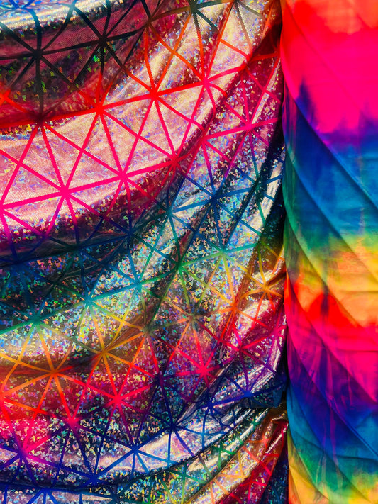 New Geometric design hologram metallic tie dye nylon spandex 4-way stretch 58/60” Sold by the YD. Ships Worldwide from Los Angeles CA