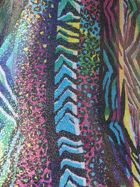 New metallic spandex multi animal print 4way stretch 58/60" Sold by the YD. Ships worldwide from Los Angeles California USA.