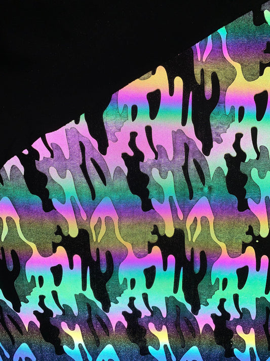 New reflective camouflage design on super techno heavy fabric 2-way Stretch 58/60” Sold by the YD. Ships worldwide from Los Angeles CA USA.