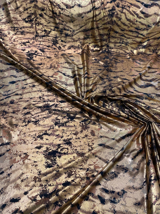 New exotic Tiger design metallic Nylon spandex 4-way stretch 58/60” Sold by the YD. Ships worldwide from Los Ángeles California USA.