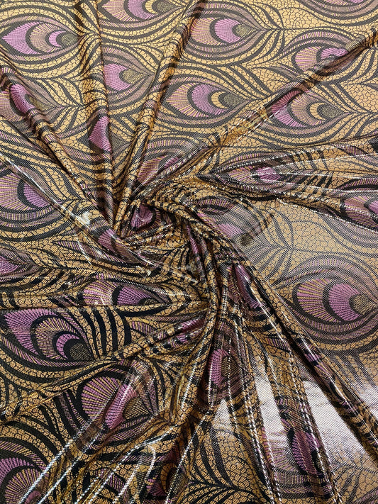 New Exotic peacock feathers design metallic nylon spandex with foil dots all over 4-way stretch 58/60” Sold by the YD.