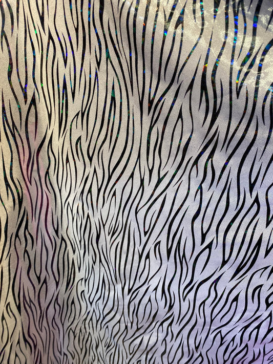 New abstract zebra design hologram foggy foil nylon spandex 4-way stretch 58/60” Sold by the YD. Ships worldwide from Los Angeles California