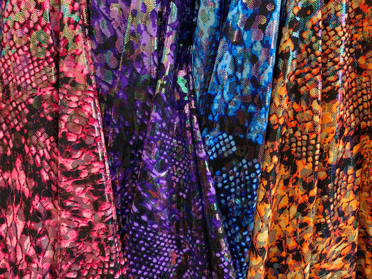 Bull snake print nylon spandex with iridescent clear snake foil 4way stretch 58/60" Sold by the YD. Ships worldwide from Los Angeles C.A USA